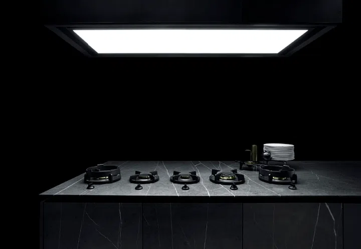 Boffi ’s black topmounted burners are completely flush with the black marble-look worktop, achieving a minimalist feel while maintaining the needs of heavy cooking. An elegant integration!