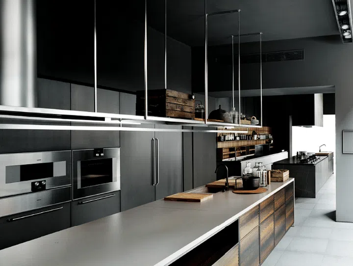 No matter the size of your kitchen, the right colours and textures – such as this silverblack palette – can create a sophisticated ambience. Opt for materials such as titanium and lead, acacia and pinewood, and black cosmic granite and white Carrara marble.
