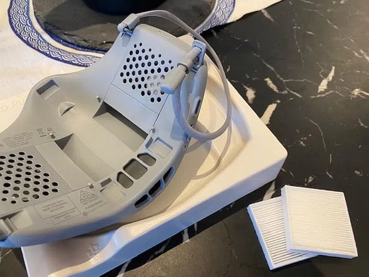 This is how the mask looks when it is all put together. The HEPA filters and protector combined help to filter out contaminants in the air, but what's really cool is that there are fans within the mask that help to moderate the flow of air into the mask as you are breathing. You'll be able to hear the fans spin with each breath you take. At first, I felt like Darth Vader with the mask on because there's a low whirring sound every time you breathe in, but after a day or two I don't notice it at all anymore. more importantly, thanks to the internal fans, breathing through the mask is much easier compared to using disposable or fabric masks. The fans work harder when you take in deeper breaths, regulating the flow of air to suit your intake level. Over time, your breathing feels regular and normal again.