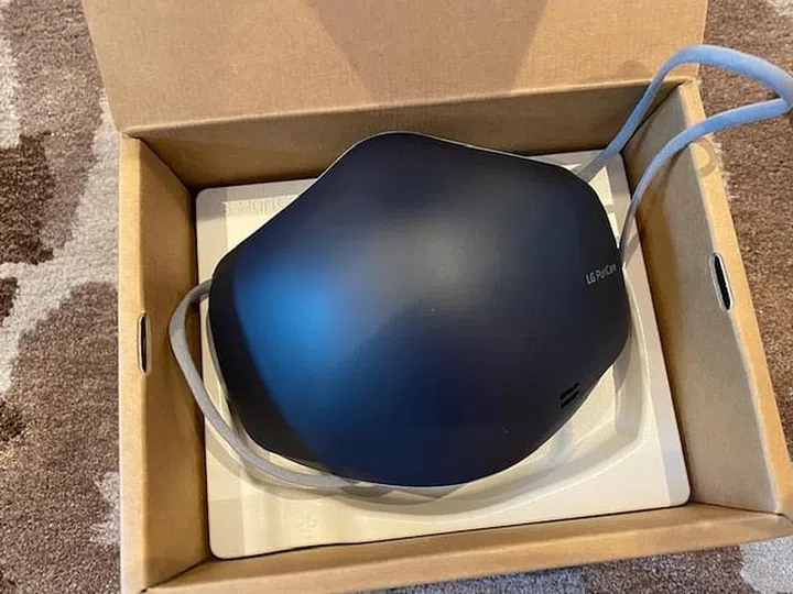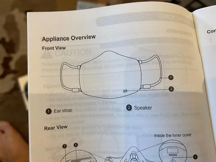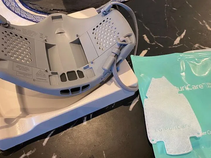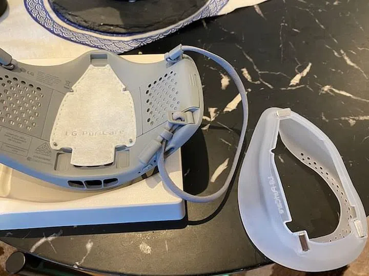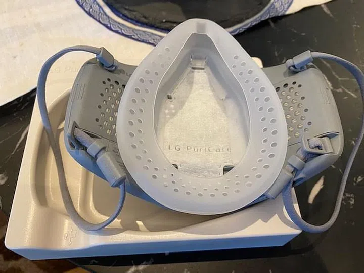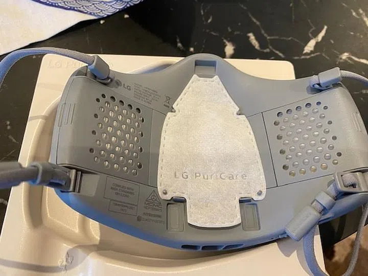 Upon unboxing, you'll see the Gen 2 LG Puricare Air Purifying Mask in its glory. I have to say that the Gen 2 version looks much better than the Gen 1 version. Here's how the Gen 1 version looks, with raised portions jutting out from the front sides and no built-in VoiceOn feature.