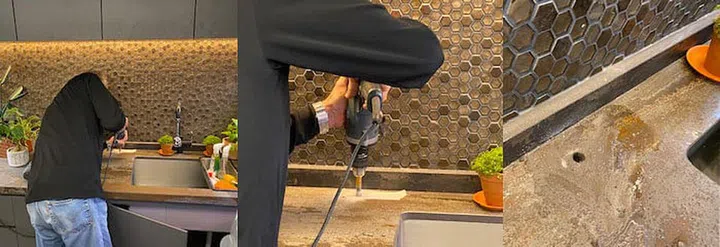 Once we've decided where the hole for the pipes connecting the Livingcare Jewel to the water mains was going to be, Jack carefully drilled a small 2cm-wide hole in the counter.
