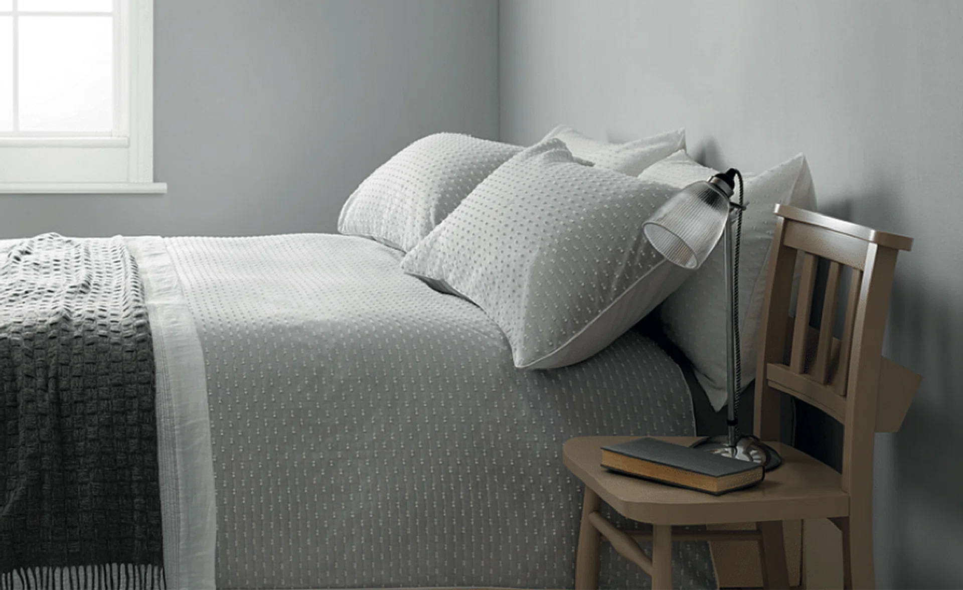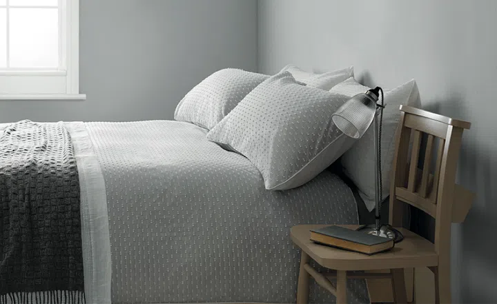 We develop about 12 design themes each season. Currently, what’s big are the Coastal (inspired by the British coast) and Fusion (inspired by North African culture) collections, and also the Croft collection – which is the key focus here. Croft reflects a relaxed, modern British style, with the slightly dreamy, romantic feel of a seaside town. It is about comfort, texture and natural materials. Hero products include recycled glass vases made in Spain, scented candles made in the UK and cushions with lovely blue and grey hues.