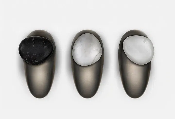 Equilibrio (Italian for equilibrium) was conceptualised to embody balance, with its organic curves and sculptural form resembling smooth stones. Only beautiful, pure materials such as marble, river stones, teak and gold are used in its design — there are 16 handle and 10 base finishings to mix and match from to create a unique statement piece for your bathroom.