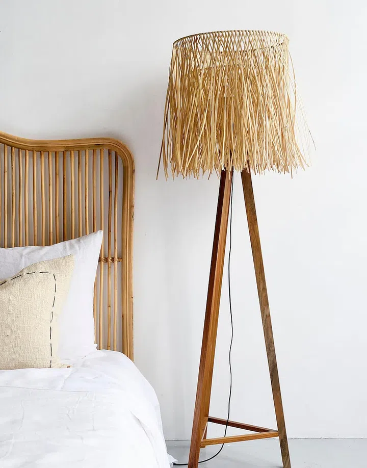 Then add on to the beachy atmosphere with this teak lamp with a shaggy rattan shade.