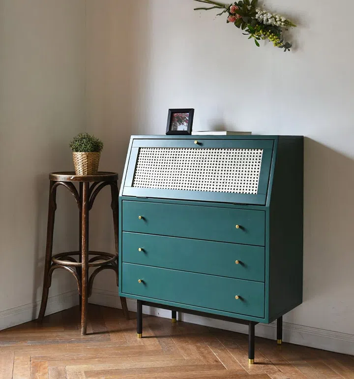The teal hue, cane panel and gold-toned capped legs of this dresser usher in a dose of vintage elegance.