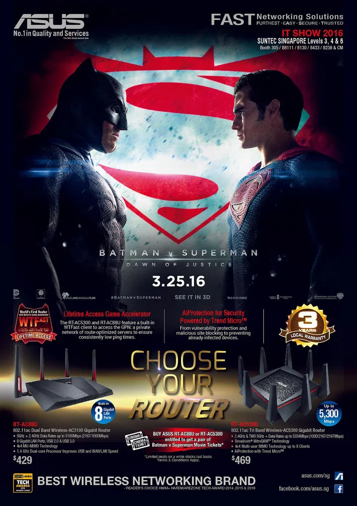 With purchase of either of the routers above, starting from March 10 at the IT Show 2016, you will get a pair of movie tickets to a special preview of Batman VS Superman: Dawn of Justice on Thursday, March 24. This promotion is valid while stocks last!