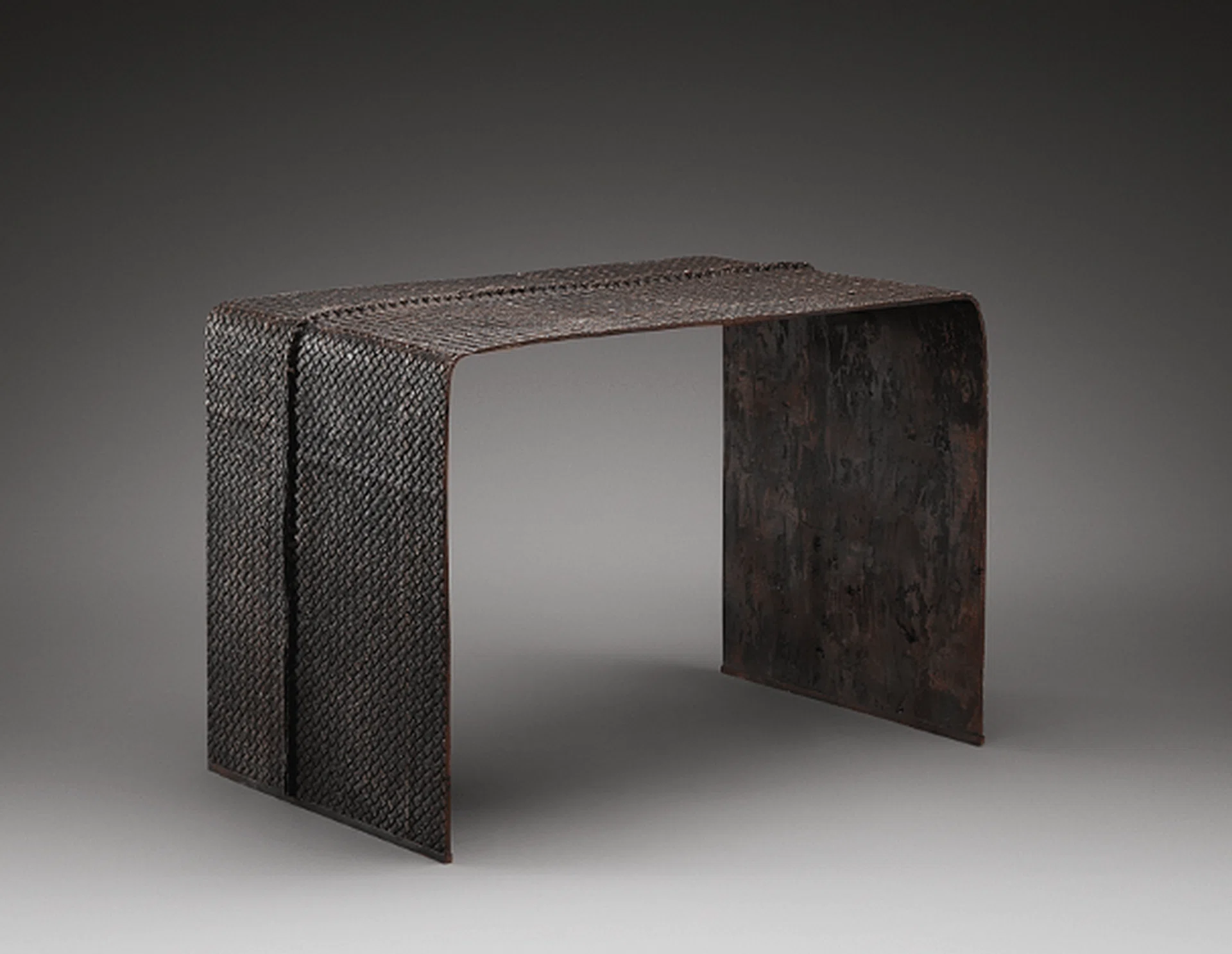 The table is entirely handmade, hence the organic and beautifully imperfect silhouette. Its bronze body is skeletal and modest, while the tabletop bears an impeccable resemblance to Bottega Veneta’s signature weaved leather pattern. The structure and patterns are made using the lost-wax casting method, which requires molten bronze to be poured into a mould.