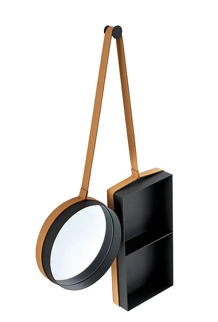 The ordinary vanity just got a revamp. Vanity Shelf from Ligne Roset, is a round mirror and rectangular shelving unit joined by a leather belt. Designed by Singapore- and Barcelona-based design studio, Outofstock, this modern, and streamlined version of a vanity counter is a fun take on the traditional mirror and table console.