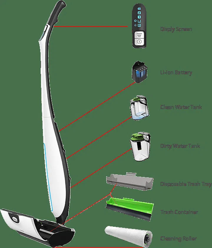 While it is only suitable for cleaning hard floor, its versatility stems from four integrated cleaning functions — sweeping, mopping, drying and self cleaning. This means its one cleaning head cleans up both dry and wet messes such as spilled cereal and chunky soup at once, while simultaneously drying the floor and cleaning itself internally as you go. The roller head sweeps up solids and absorbs liquids, cleverly separating them into a dry waste tray and waste water tank.