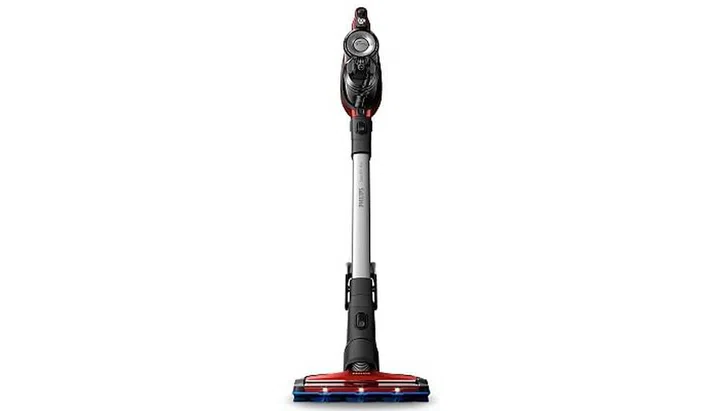 Its streamlined design means you don’t waste time adding or removing attachments as both the brush head and crevice tool are clever integrated into the rod design. A digital display on the handle shows you the percentage of battery life so you know how much juice is left, while LED light on the main nozzle help illuminate dirt in dim areas. Its flexible nozzle joint makes navigating around furniture and hard floors really easily, only requiring a bit more effort on carpets and high pile rugs. However, the canister is a bit bulky and the lid requires some tugging to remove.