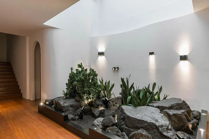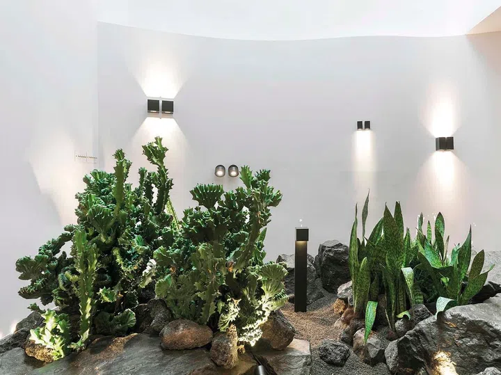 This garden serves as the foreground to Sol Luminaire’s in-house architectural lighting label AEON’s latest products.