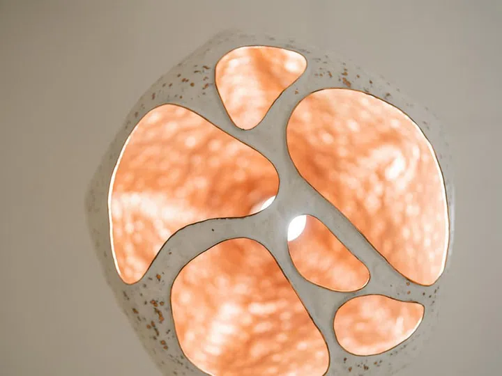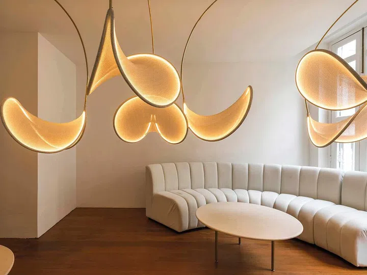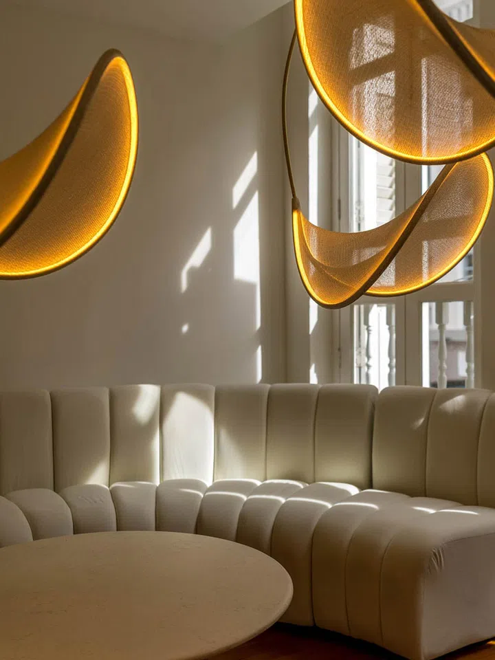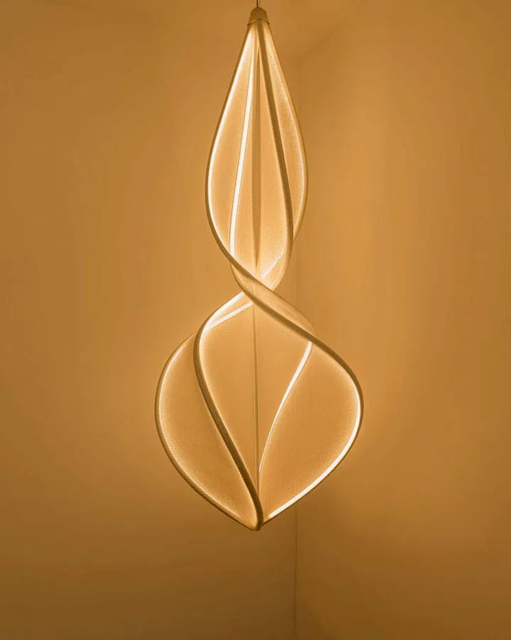 Made with polyester tricot wrapped on brass frames, llll’s products are part artwork and part functional lighting.