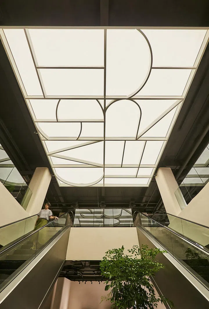 The ceiling above the escalator features a Barrisol with a custom Castlery ironwork grille that shines a light on a zen garden below it.