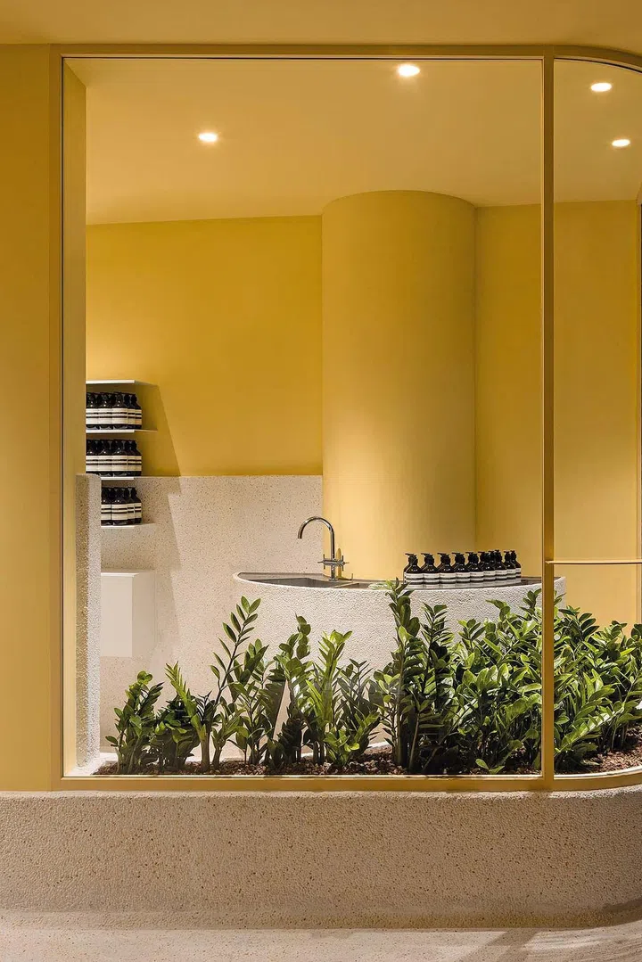 Created by the in-house team led by French architect Marianne Lardilleux — Aesop’s head of global store design since September 2020 — Singapore’s latest boutique is nestled in the bustling Tampines Mall. It features a large hand-cast pebble wash monolith that serves as a central island with two basins. The surrounding walls are fitted with shelves filled with all the cult-favourite brand's products — most of which packaged in the iconic amber glass bottles.