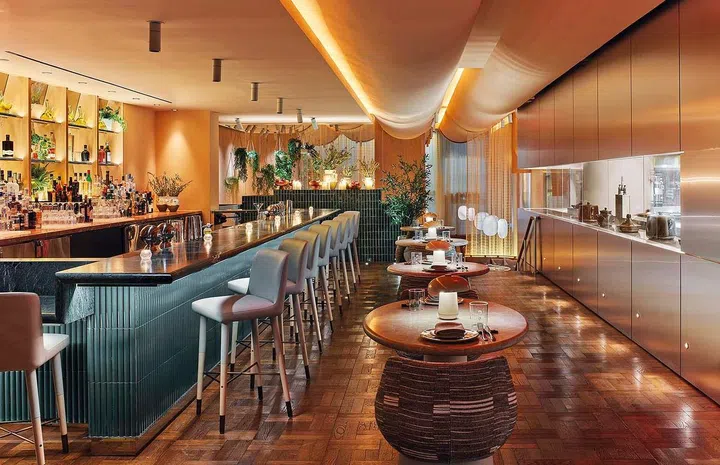 Casa Dani is located beside quick-service dining concept Pollo Verde, which specialises in rotisserie chicken. Guests are greeted with a display of terracotta and glazed pots and the chef’s Spanish olive oils. From here, guests are led through a compressed space reminiscent of Spanish villas, with an undulating ceiling and warm walnut parquet flooring.