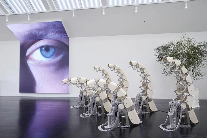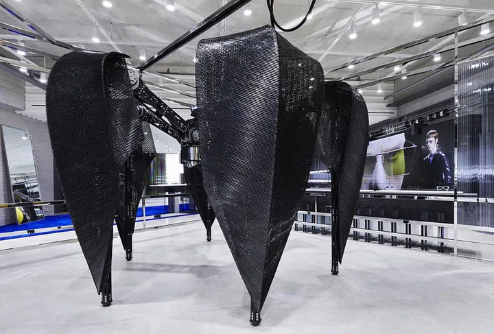 The Probe, a six-legged walking robot created by the brand’s robotics lab, presides over the sunglasses collection on the third storey.