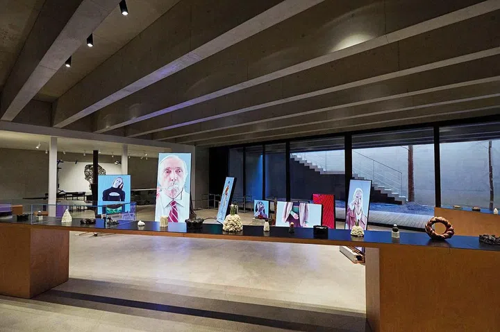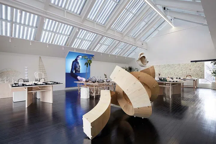 A long table at the centre of the space greets visitors with an array of gourmet pastries crafted to look like minimalist design objects.