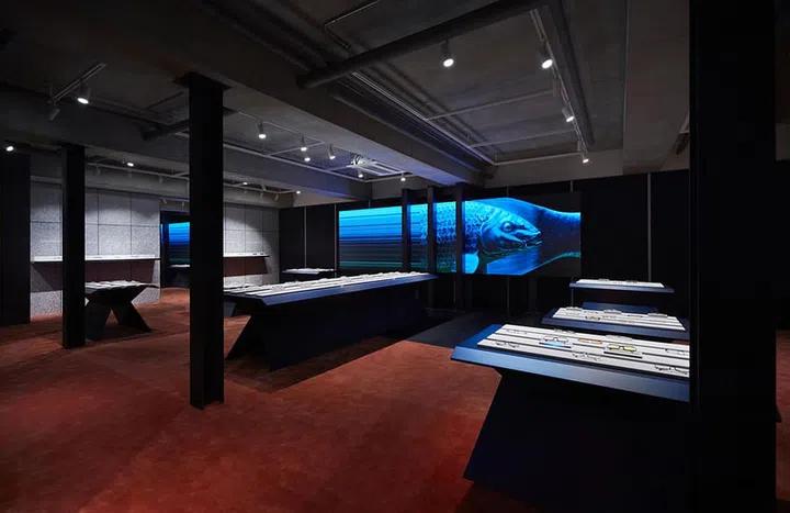 The second storey displays optical eyewear collections in a hypnotic ambient courtesy of a video installation called Truth or Dare by Jones Lindstroem.