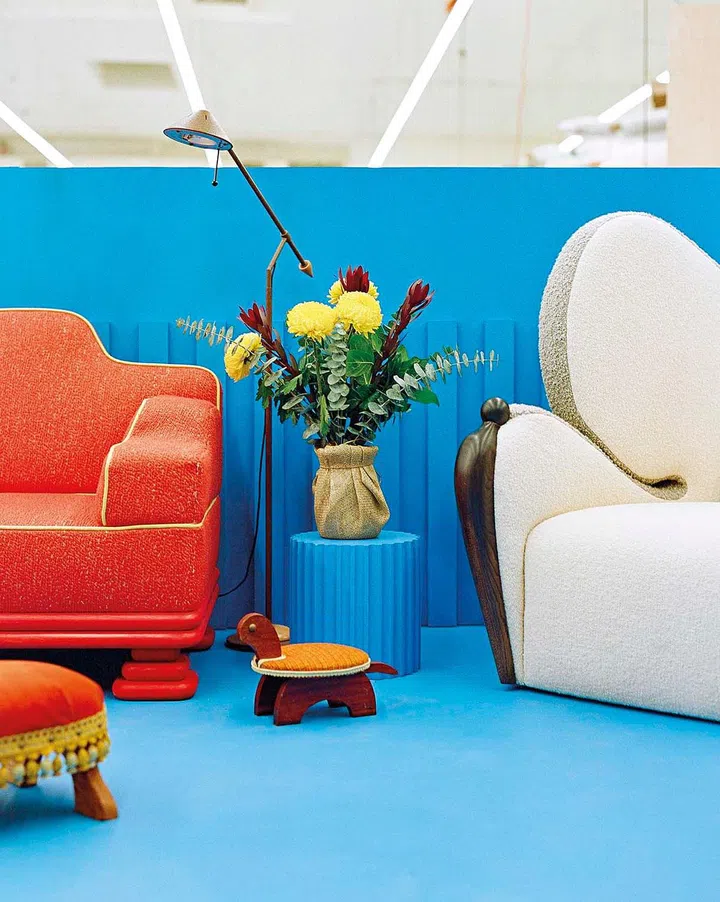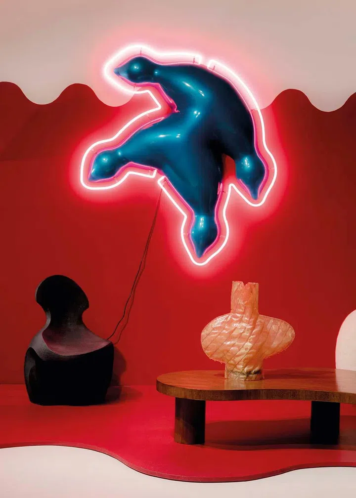 In this space that honours French savoir-faire, different styles and eras mix. As an example, Minjae Kim designed a sculptural wooden black lacquered floor lamp, and Ian Felton created a lava stone coffee table with sculptural wooden legs especially for this project, while Garance Vallee presented surrealist paintings. The original artworks of Maison Royere, Simone Bodmer-Turner, Gauthier & Compagnie, and Carvalho Park are combined with works from R & Company and Lehmann Maupin, and others bring a singular visual language to life through a dream scenography with mesmerising objects.