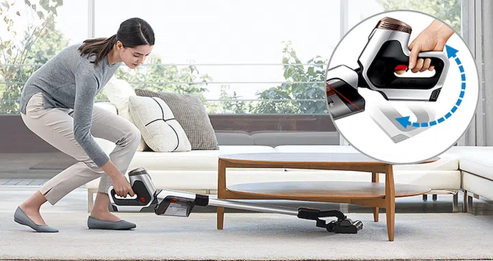 Reach under furniture such as sofas and beds easily with the Powerstick Pro’s patented ergonomic Flex Handle, which can be tilted around by a maximum of 50 degrees. You’ll never miss a corner again! This feature also minimises strain on the wrist, muscles and back.