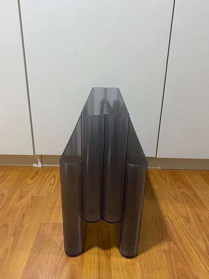 Designed in a step-like arrangement with four pockets, the Kartell magazine rack was designed by Giotto Stoppino.