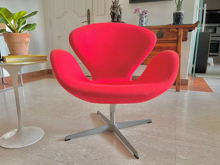 Designed by Arne Jacobsen in 1958 for a royal hotel in Copenhagen, the Swan chair is a lounge chair with organic and soft curves that resembles a swan when viewed from the side profile.