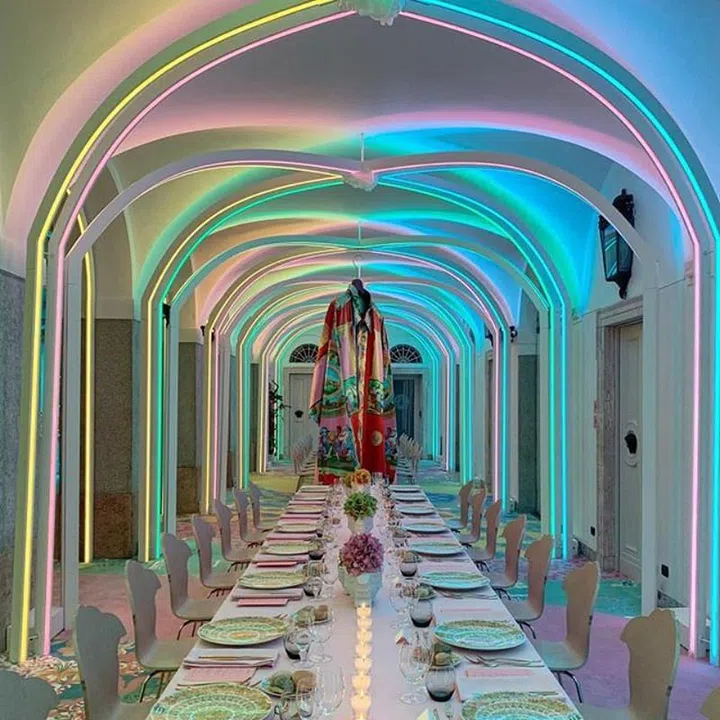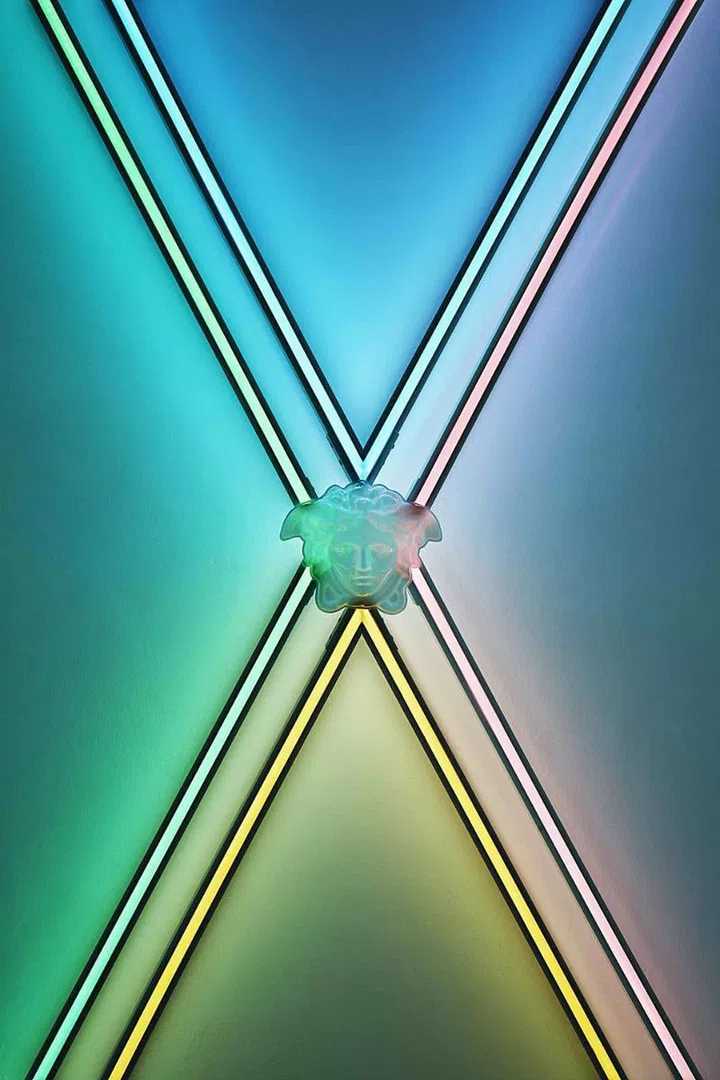 In true Versace form, the luxurious Italian fashion house showcased its home collection in Milan Design Week in a spectacular and dramatic way. The rainbow and neon-coloured concept was the work of designer Sasha Bikoff and artist Andy Dixon.