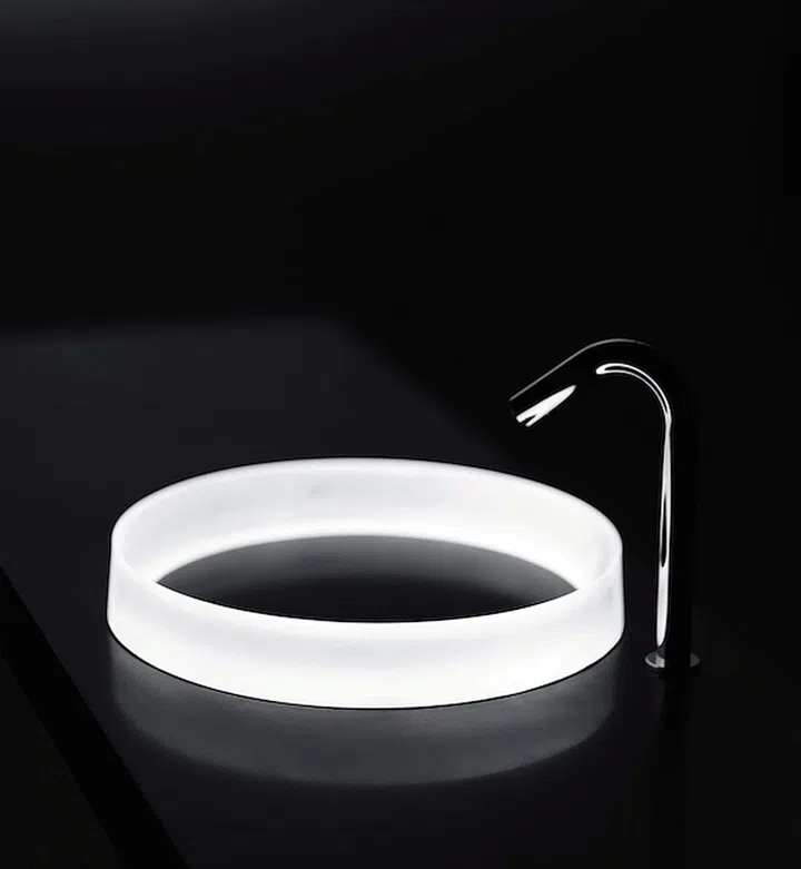 A Red Dot Design Award winner, this unconventional hybrid epoxy resin basin lights up from beneath to create an eye-catching ring of light that makes the basin look as if it’s floating, especially when placed on a black countertop!