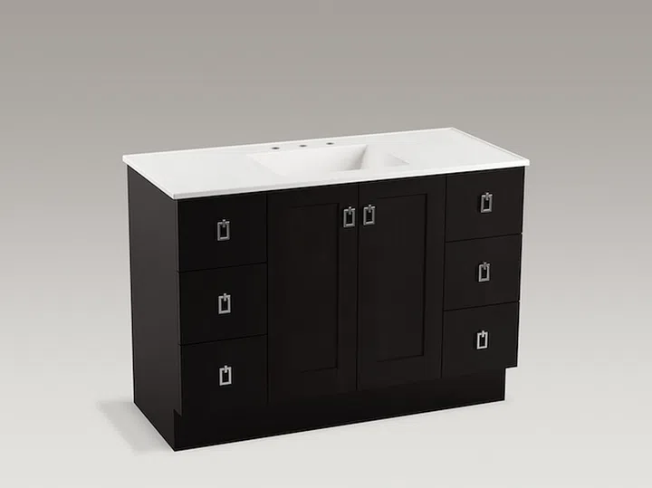 This Shaker-style cabinetry adds an accent with its unique options of handles that will pop in a dark-hued spac e. The sleek frameless construction of its soft-close doors and deep drawers makes this piece a stylish storage solution to have. Catalysed conversion varnish provides a durable moisture-resistant finish that’s perfect for bathroom settings.