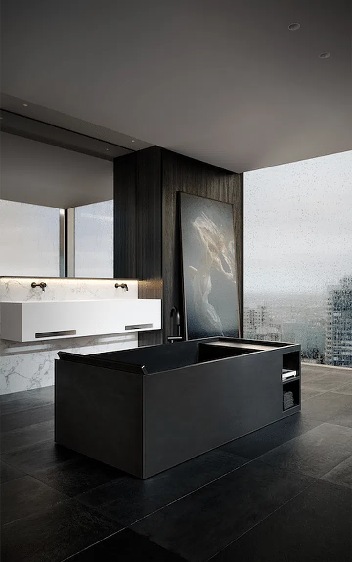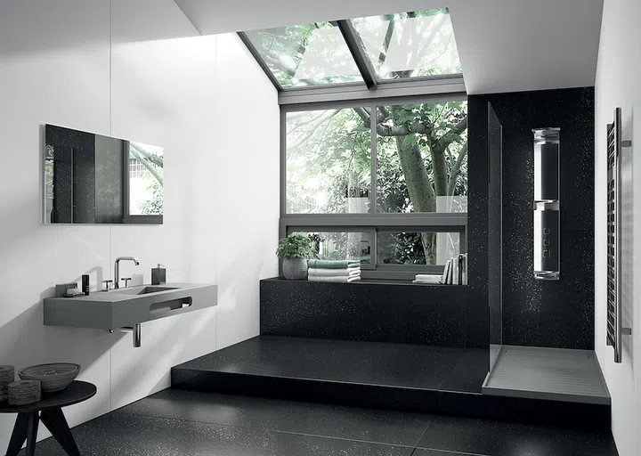 Consider materials with stain-resistant and non-porous properties, as this space is often wet and humid. One option is Silestone. It combines natural quartz and raw materials great for use on surfaces, as they are durable and easy to maintain. For a dark-coloured space, choose Carbono from Silestone Platinum series, with a polished sheen for a touch of opulence.