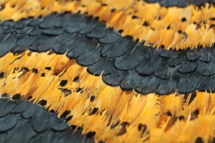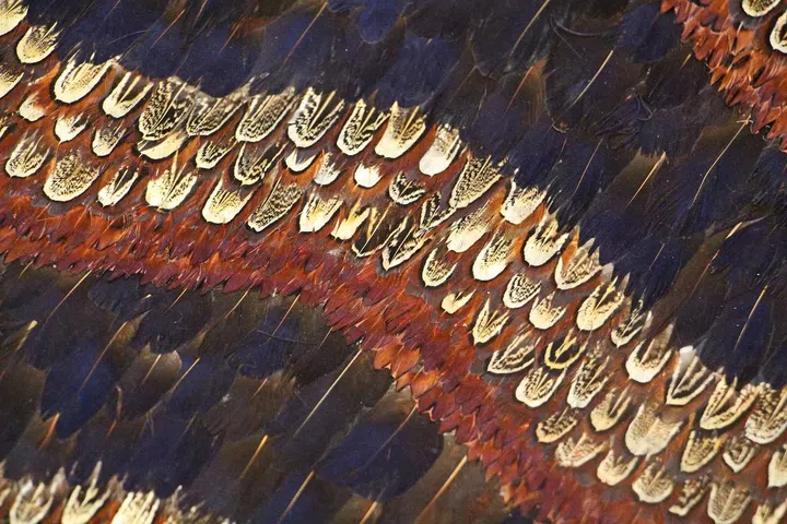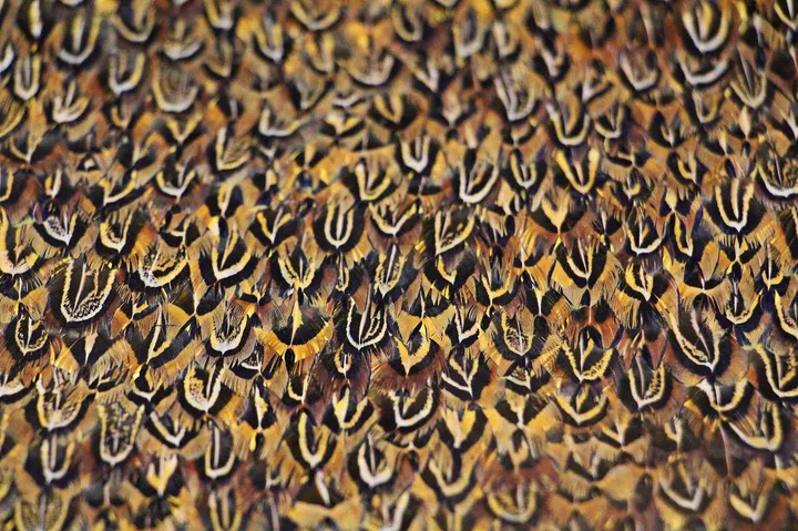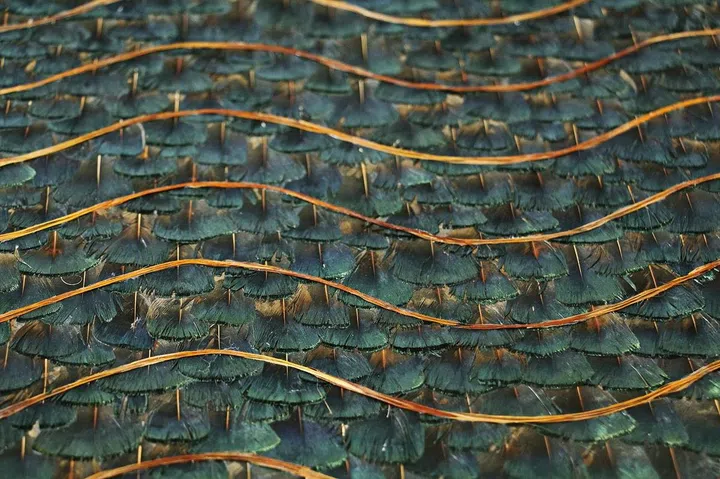 Colourful and exotic peacock, quail and pheasant feathers are artfully arranged in flowing waves and other geometric configurations for attractive surfaces.