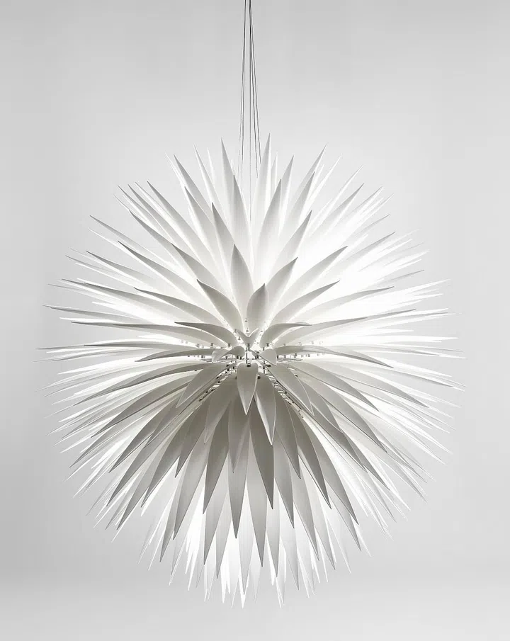 Part of the collection is the dramatic White Flax pendant lamp (pictured), consisting of 350 handcrafted "leaves", arranged for even light distribution.