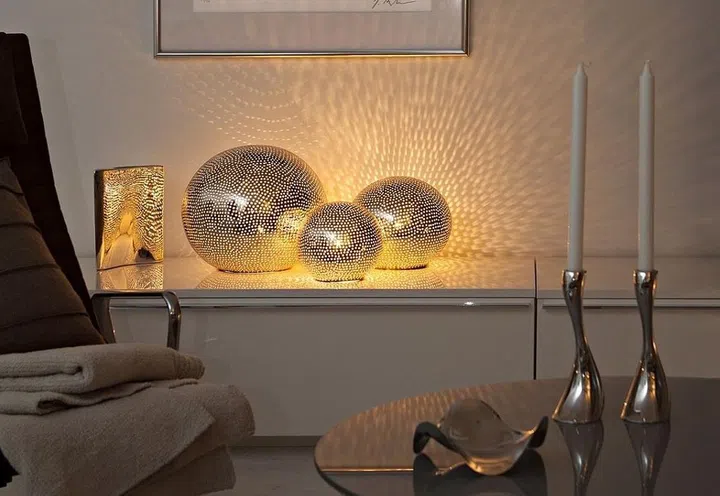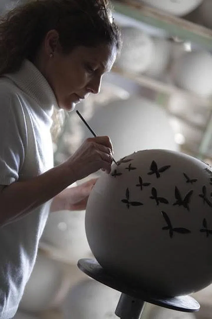 Each lamp is carefully shaped and carved out of clay by hand, then finished in white or metallic tones.