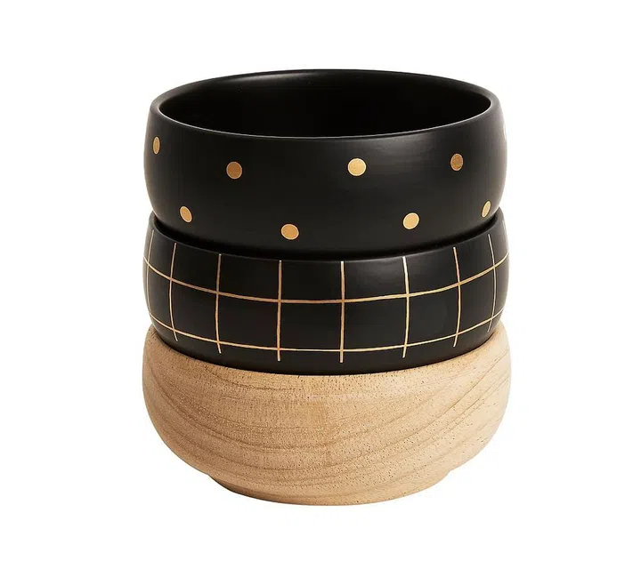 The designs make use of geometric patterns and materials such as ceramic, wood and metal — a balance of warmth and cool.