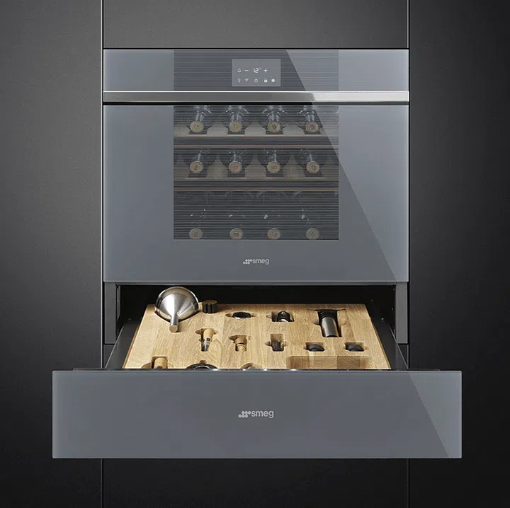 On top of the oven collection, wine connoisseurs will be excited to know that Smeg also carries 45cm wine cellars and sommelier drawer, which houses a sommelier tasting kit including a steel and wood corkscrew, steel vacuum wine saver with two silicone corks, a Spumante wine cork, cork to pour wine, a drip-catcher, sparkling wine steel and wood cork, a pair of Spumante pincers, a thermometer with housing, a red wine cork, and steel and wood funnel. These appliances and fixtures can line your kitchen wall to add convenience and functionality at home.