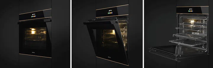 The touch controls appear backlit on the colour display, while the glass handle pops out with a slight touch, and only when required. When not needed, it is recessed into the surface. An added feature is also the soft-close mechanism for all oven doors.