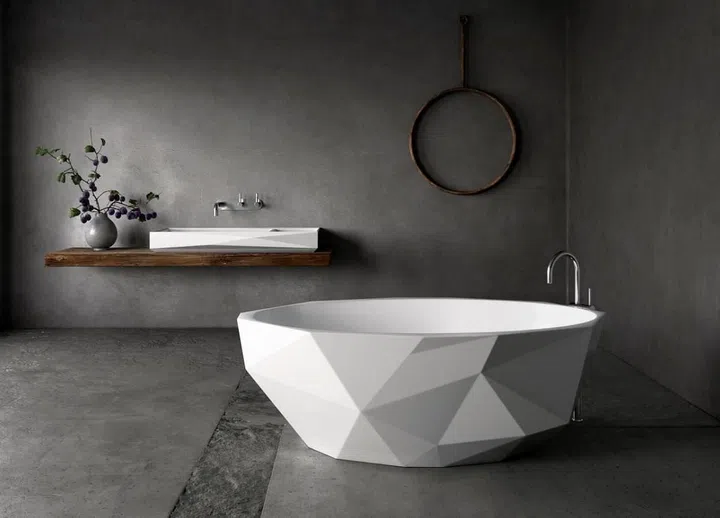 Designed by renowned interior designer Kelly Hoppen, this bath is part of the Bijoux collection for bathware brand apaiser. The faceted exterior of the bath is inspired by the angular shape of cut diamonds, which is uniquely juxtaposed with its smooth interiors.
