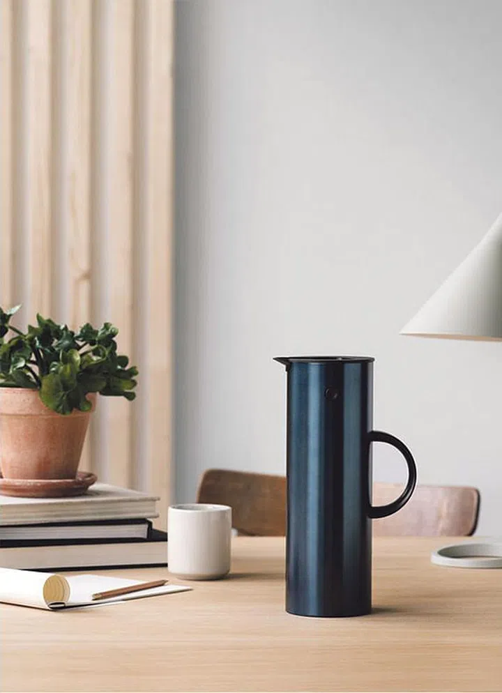 One of its most famous items is the EM77 Coffee Vacuum jug, a tall and narrow cylinder designed by Erik Magnussen. This coffee jug has a patented unique rocker stopper near the lid, that lets users serve with just one hand, and a handy screw cap, which keeps liquids from spilling.