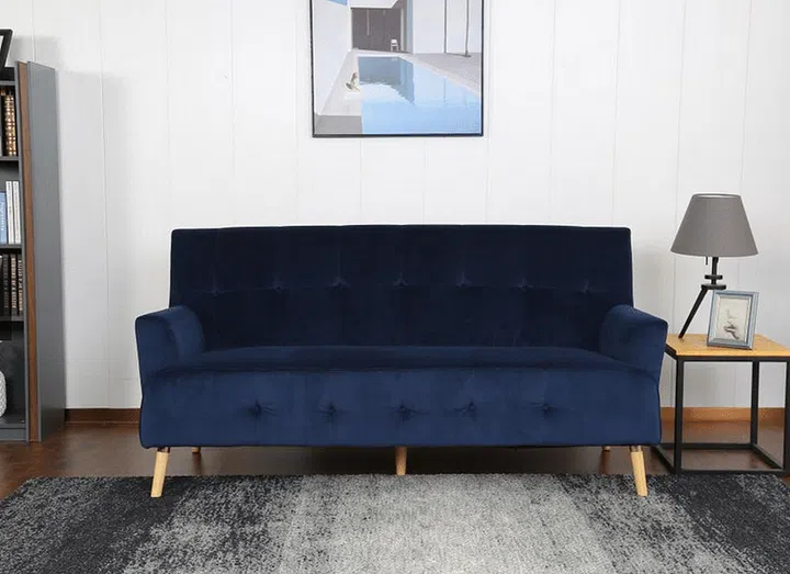 Introduce this tufted sofa in a rich blue hue for a bold dose of colour and elegance in your living room; its structured shape adds modernity to your interiors, too.