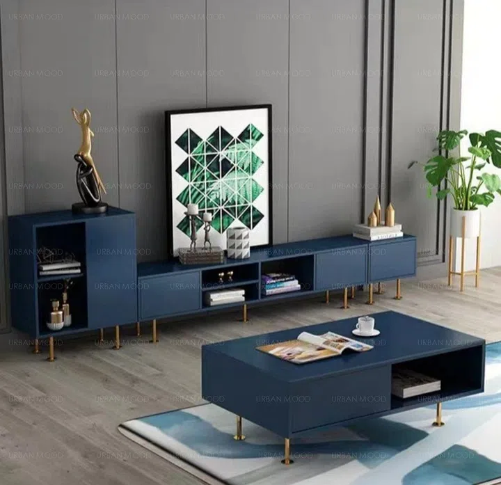 This stylish TV console marries form and function with plenty of storage space, a gorgeous blue hue and svelte metallic legs that turn up the luxe factor.