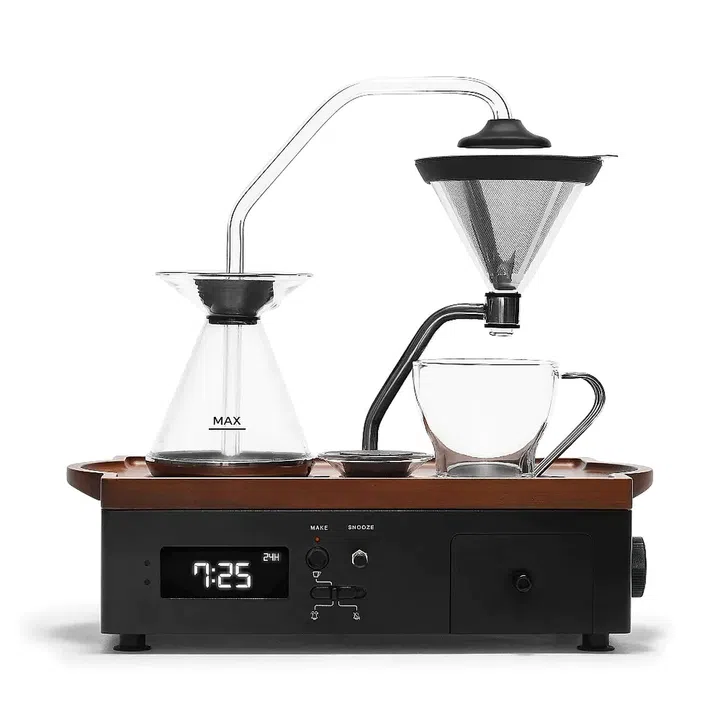 Another item for coffee connoisseurs in the home office – except this time, you’ll literally be waking up to the aroma of freshly brewed pour-over, served on a walnut tray out of high-quality borosilicate glassware. The alarm clock has a compartment for keeping your milk chilled overnight. A little extra? Maybe, but who’s complaining?