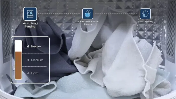 The AI Wash utilises sensors to detect the weight and softness of the fabric in each load, and AI algorithms to recommend optimal settings such as water level, intensity, washing, and rinsing times for each specific load type. It allows more fabric care compared to traditional wash cycles. The fabric sensing feature in the AI Wash Technology can differentiate up to 3 fabric types, such as normal, delicates, and towels, in a wash load under 3 kg and provide better fabric care in the long run.