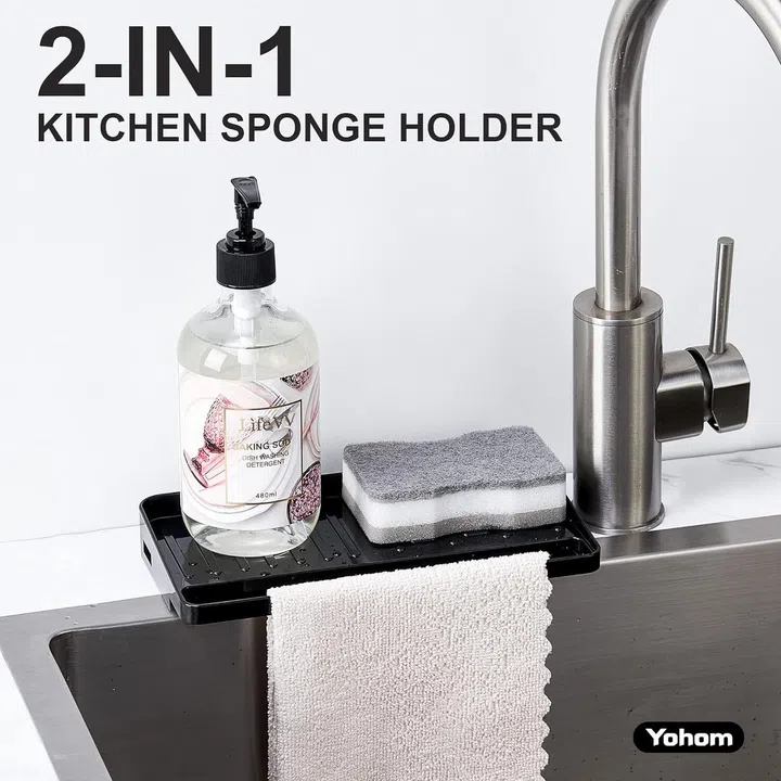 Keep your kitchen sink organiser and drip-free with the YOHOM sponge holder. This handy tool allows for a tidier space, managing soap overflows and providing a designated spot for your wash cloth.
