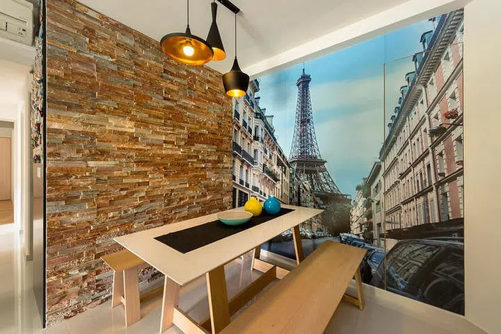 A photographic mural of a street in Paris welcomes visitors at the dining area right by the home's entrace.
