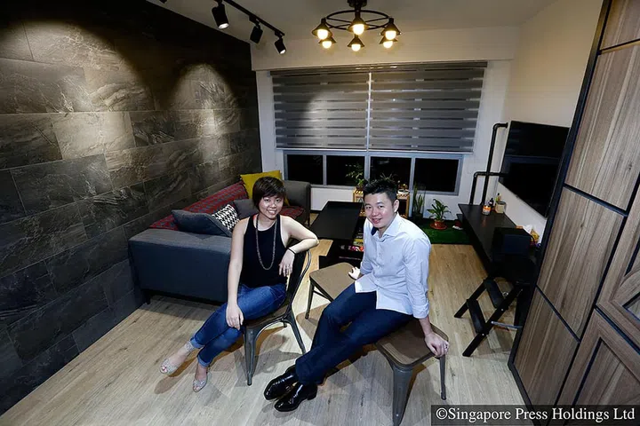 Public relations account director Goh He Lin and her husband, bank analyst William Toh, at their four-room Housing Board flat in Kim Tian Road on 18 July 2015. The couple saved about $2,800 by buying their four ceiling lamps and two bedside lights from Taobao, leaving them more money out of their $40,000 renovation budget to spend on other items.