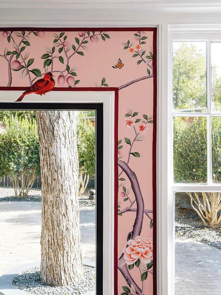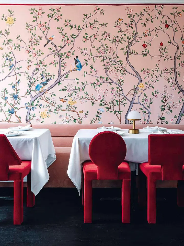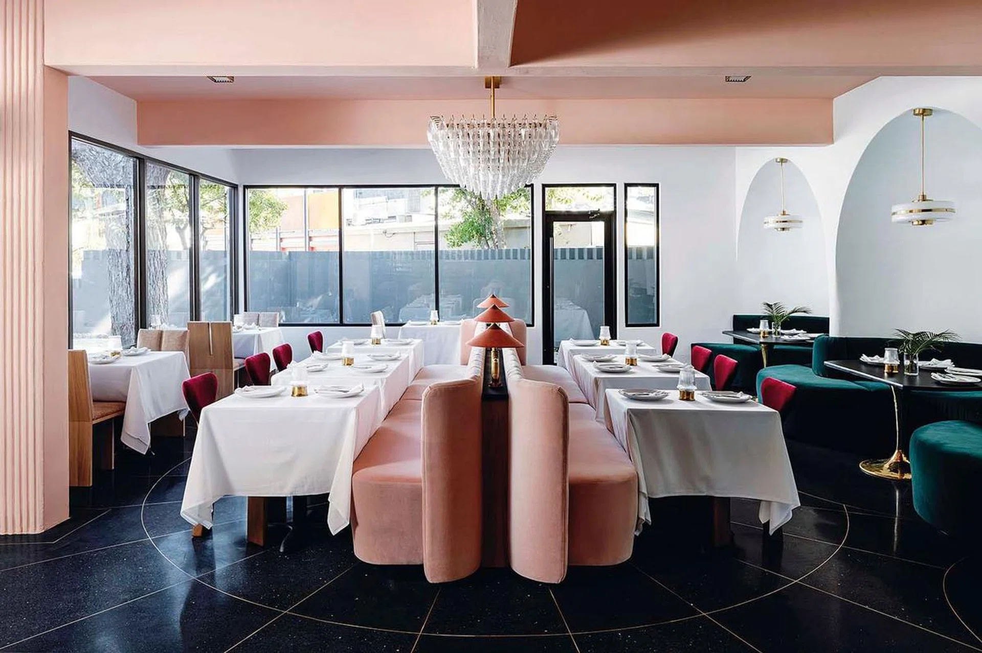 Pink, the restaurant owners’ favourite colour, formed the basis of the palette. Deep green and bright red also appear. Brass, marble, and velvet provide a glamorous atmosphere. “We wanted to give the space a subtle art deco vibe, but with a modern, feminine twist,” says the interior designer. “We added natural white oak finishes to warm up, modernise, and contrast with the heavier selects.”
