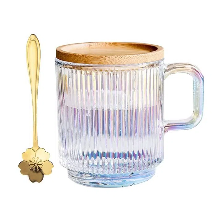 Clear Iridescent Coffee Mug with Lid and Sakura Spoon