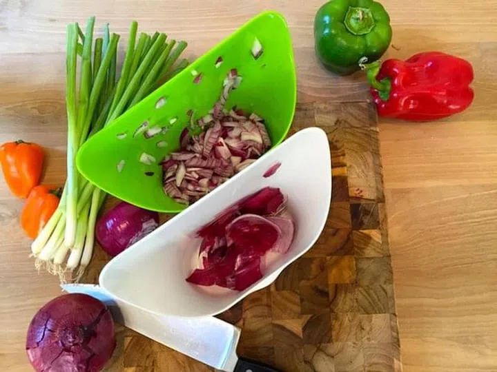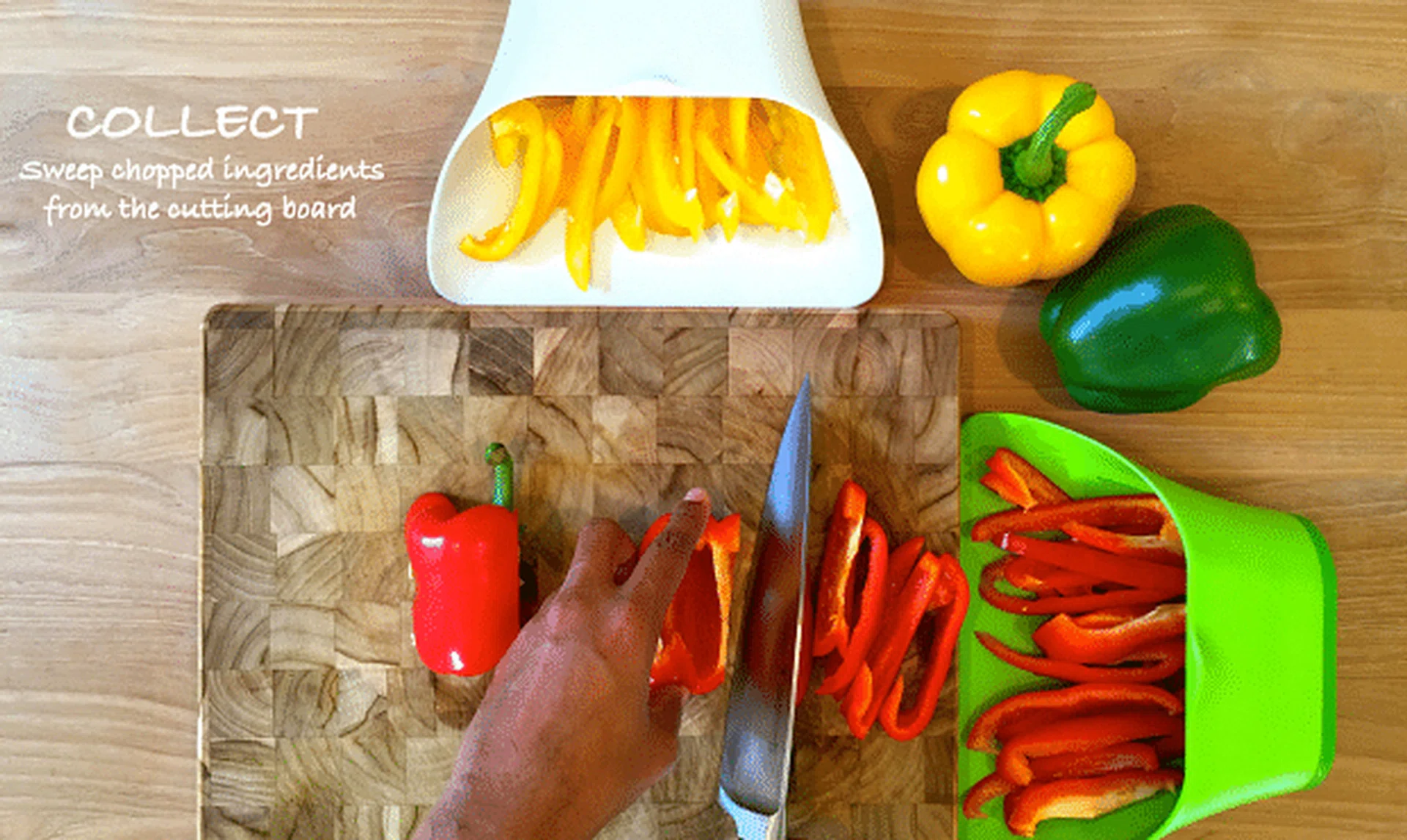 ChopTainers are versatile container bins for your chopping board. Invented by kitchen innovation company ThinkHat, ChopTainers feature a shape which matches any cutting board, allowing easy scooping of ingredients as well as pouring into bowls, pots and pans.