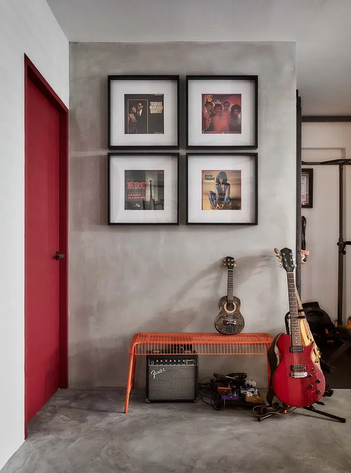 A stainless steel key box, adorning the wall between the music station and gym, adds to the industrial-esque aesthetics.