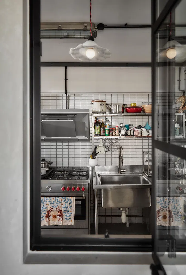 Much of the kitchen fittings and equipment was moved over from their previous home. The husband and wife sourced the extremely industrial pieces, like the sink and racks, from a stainless steel warehouse, specialising in second-hand professional kitchen and hawker vendor equipment. When these restaurants and hawkers close down, they sell their kitchen equipment to this warehouse.